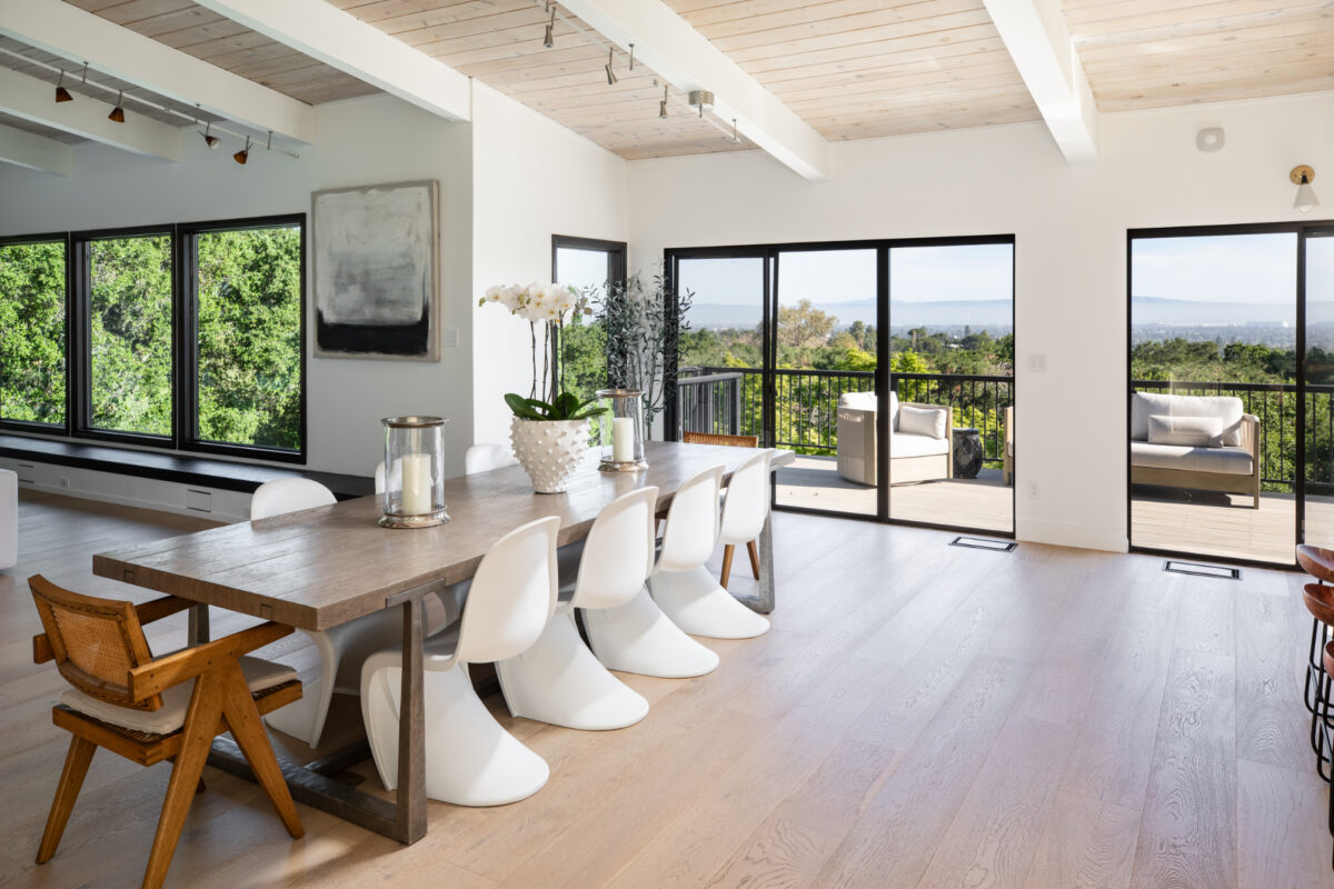 Sweeping Bay views, exceptional privacy, and a whole-home renovation define this architectural contemporary on one acre with solar power. Positioned well back from the street, the property offers a wonderful sense of seclusion while opening to expansive Bay views out to the San Mateo and Dumbarton Bridges and across the East Bay hills and Silicon Valley. The redesigned interior centers around an open-concept layout with vaulted paneled ceilings and white oak floors throughout, plus beautifully remodeled kitchen and baths, all finished with a fresh, designer aesthetic. There are 5 bedrooms, an office, and 3.5 baths (one with sauna), arranged to support both everyday living and flexible lifestyle needs. Outdoor spaces are equally compelling, with level areas for recreation and entertaining, a Bay-view deck, pool and spa, plus new lawn. This home delivers dramatic design, resort-style livability, and a rare connection to both nature and the San Francisco Bay.
