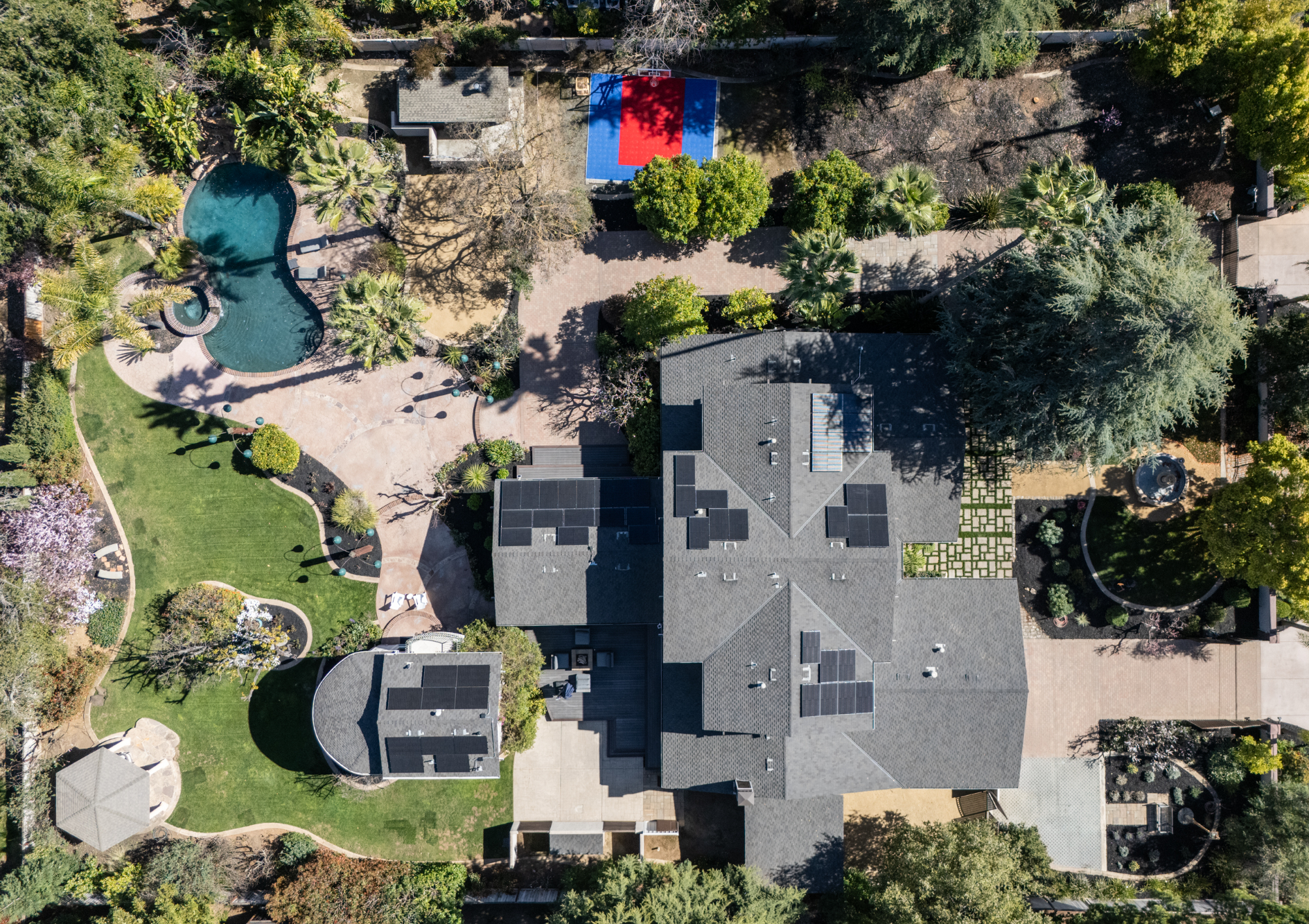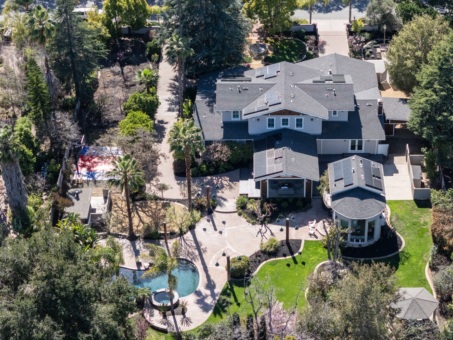 Extensively remodeled and expanded, on approximately 0.86 acres, this exceptional gated property offers luxury living on a rare legacy setting. Once the site of one of Los Altos’ earliest “in-town farm” developments, the property today has been transformed for extraordinary entertaining on a grand scale. Expansive stone terraces, lawn, decks, and a heated loggia connect the indoors to the outdoors, all designed for effortless gatherings around the pool, spa, and waterfalls. The two-story home features 4 bedrooms, an office, 4 full baths, and 2 half-baths, plus a separate 1-bedroom, 2-bath ADU, also ideal for guests or extended celebrations. Generous proportions and an open layout are supported by primary and caterer’s kitchens, a full bar, wine cellar, and a separate living room or media room. The luxe primary suite and dedicated office are located on the main level, with three additional bedroom suites plus lounge upstairs. All just moments from the Los Altos Village and served by excellent Los Altos schools.
