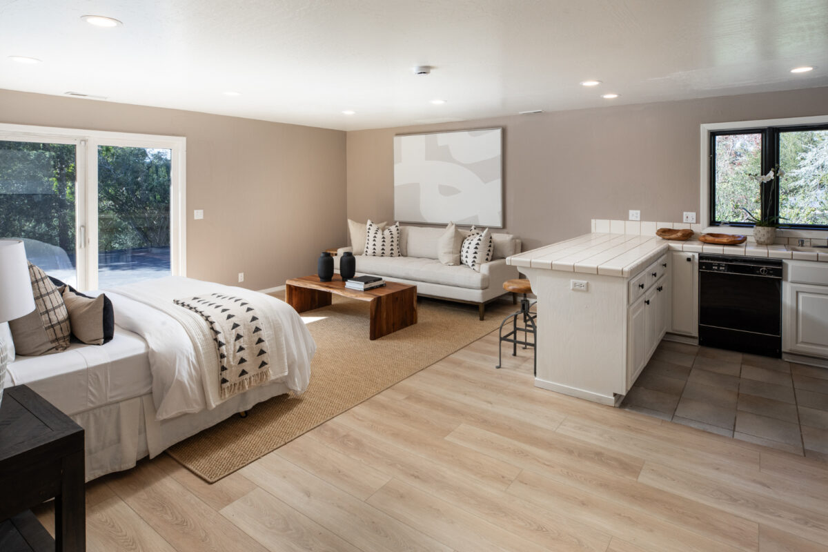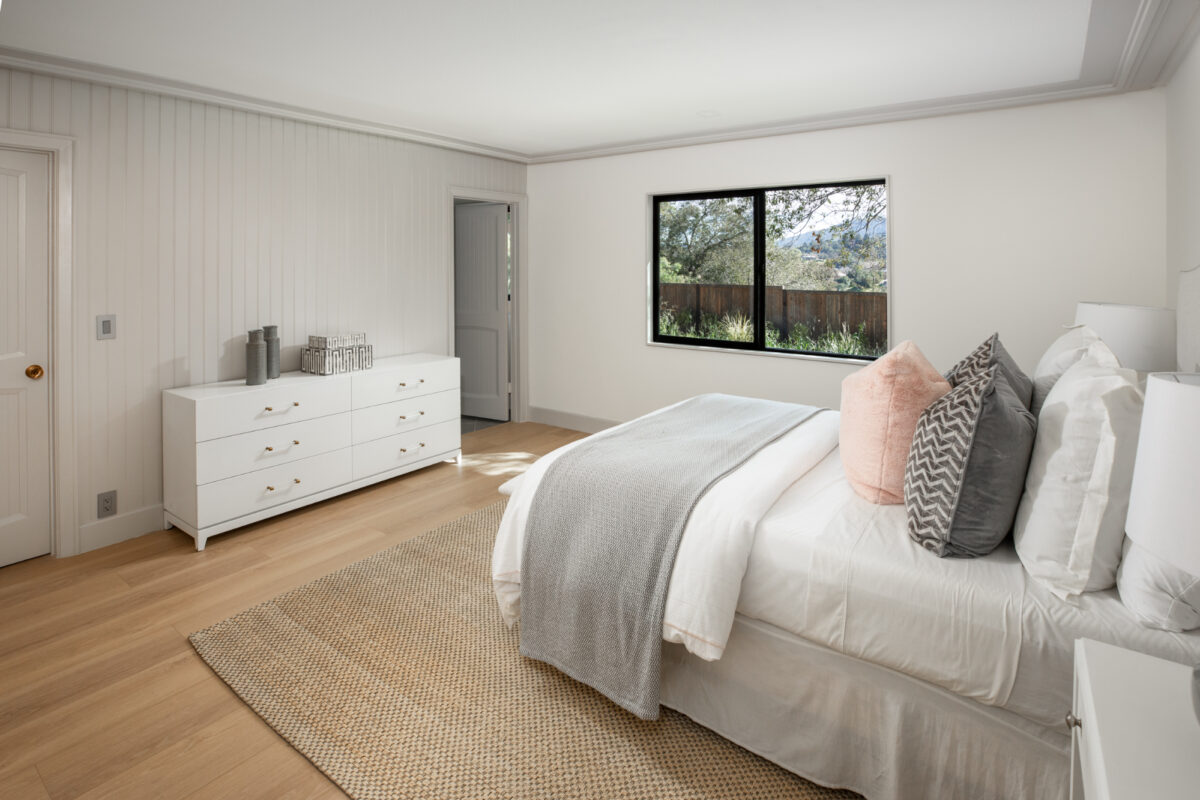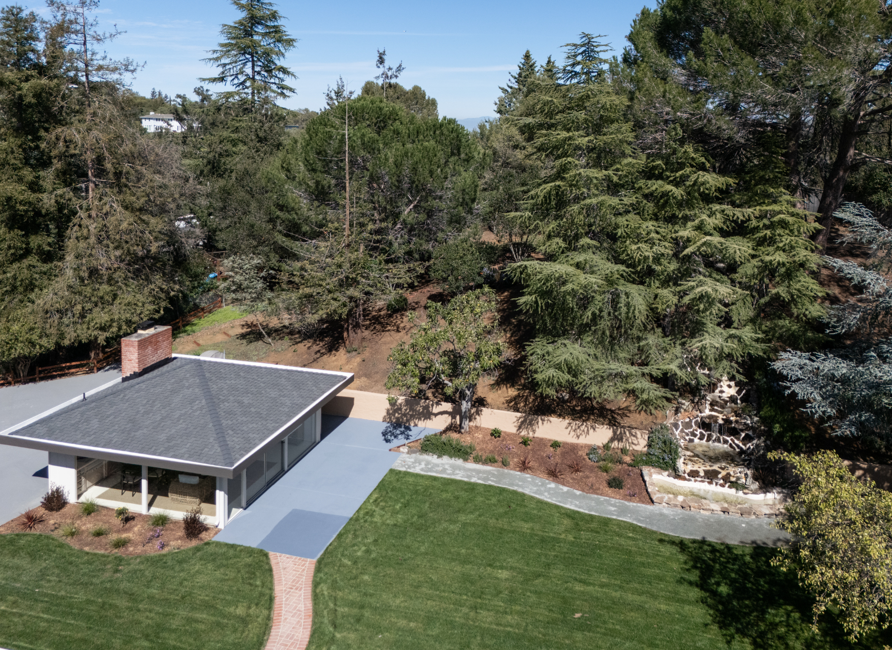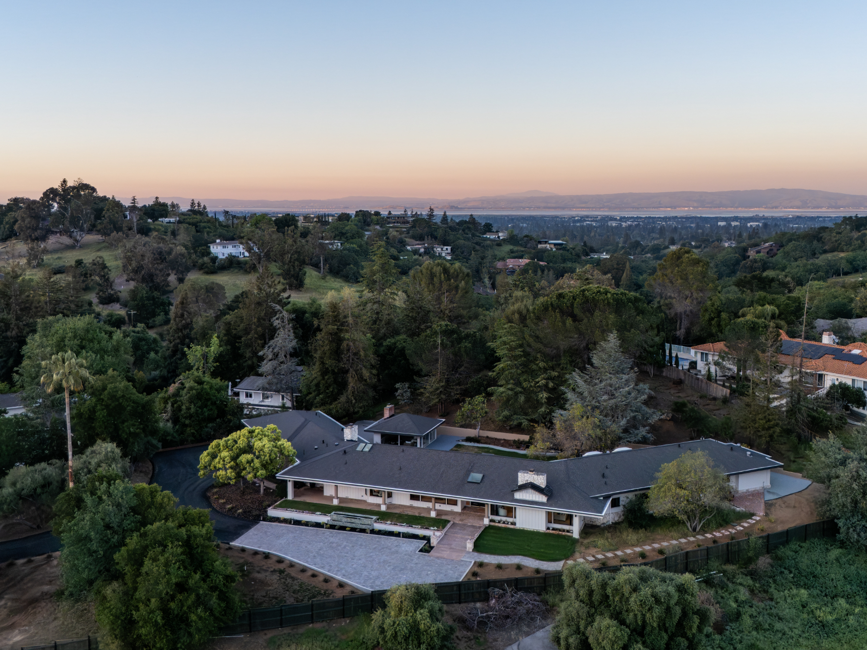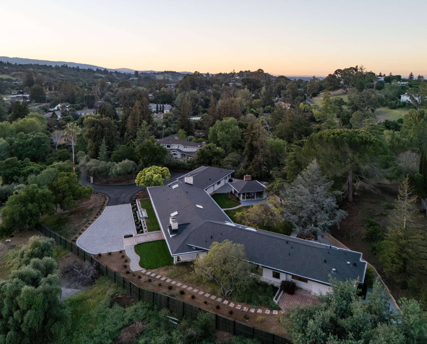 A newly completed whole-home, fully permitted renovation has transformed this property into a showcase of chic designer style, inside and out. Positioned at the end of a lane atop a gentle knoll, the setting of approximately 1.5 acres is surrounded by mature trees and olive groves offering a serene, resort‑style environment enhanced by elegant waterfall fountains and thoughtfully curated outdoor spaces. The single-level layout comprises 4 bedrooms, 4.5 baths, plus a bonus junior ADU with 1 bath. Formal and casual living spaces flow with ease, including a versatile living room that doubles as a media room, a formal dining room with custom wine cellar, and a reimagined kitchen and family room opening to the rear grounds. The grounds and fully enclosed cabana await outdoor living and entertaining, complete with custom water features at both the front and rear. This close-in setting is just 1.5 miles from the Village and has access to excellent Los Altos schools.